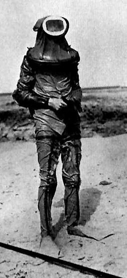 My friends harnessed the three-cylinder block on my back with the regulator riding at the nape of my neck and the hoses looped over my head. I spat inside of my shatter-proof glass mask and rinsed it in the surf, so that mist would not form inside. I moulded the soft rubber flanges of the mask tightly over forehead and cheekbones and then fitted the mouth-piece under my lips and gripped the nodules with my teeth. A vent the size of a paper-clip was to pass my inhalations and exhalations beneath the sea. Staggering under the fifty-pound apparatus I walked with a Charlie Chaplin waddle into the sea..